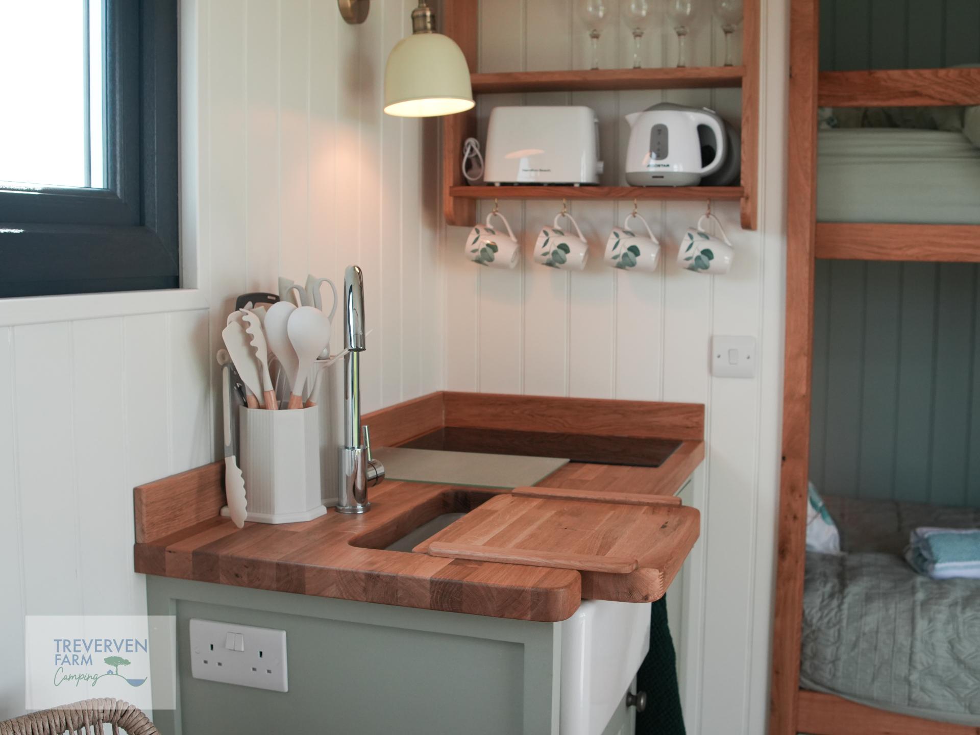 - Small kitchen area, fridge, sink, hob, toaster kettle and air fryer plus cutlery, crockery and cookware.